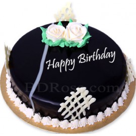 2.2 pounds delicious American chocolate round shape Cake is covered with soft black icing and decorated with two big white cream flowers and white chocolate from California..