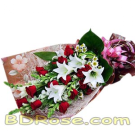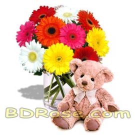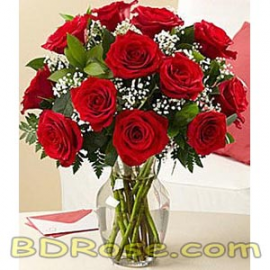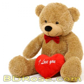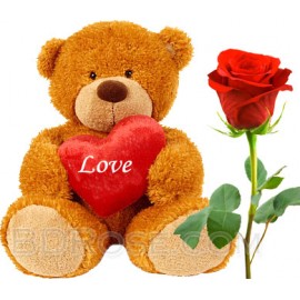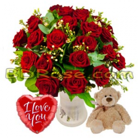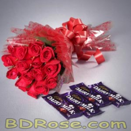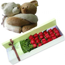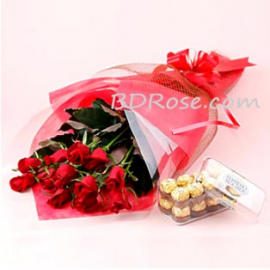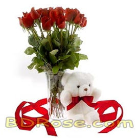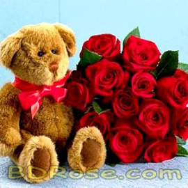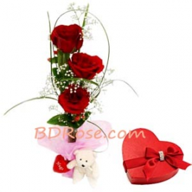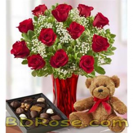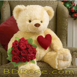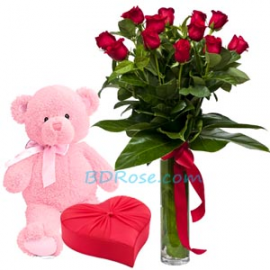 12 inch size soft pink teddy bear holding 12pcs red roses in a nicely wrapped bouquet and a imported eclairs heart shaped chocolate box.
