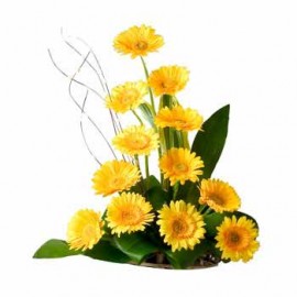 Send a friend this pretty token of your affection and friendship. Featuring a vase arrangement of half dozen yellow carnations with baby’s breath, greenery, and matching bow.