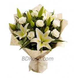 Gift your some-ones a wonderful and amazing arrangement of white lilies and rose. It symbolizes elegance, thoughtfulness and care for the person to whom you are sending this floral arrangement. This gift consists of Imported 4 White lilies and 6 rose in Bouquet...