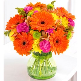 Send someone special 6 pieces orange gerberas, 6 pieces pink carnation and 1 piece yellow mums in a startling flower vase. This delightful treat is sure to and joy to any occasion celebration...