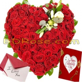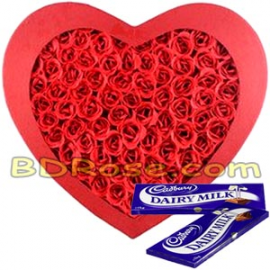 100pcs red roses in a heart shaped box with 2pcs imported testy cadbury dairy milk chocolates...