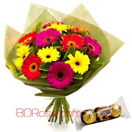 12 Pieces colorful gerberas in a bouquet with 3pcs imported Ferrero Rocher chocolate. Send this beautiful flower & chocolate to your loving father in Bangladesh...